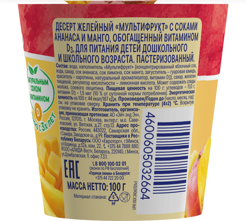 Десерт желейный Мультифрукт 100 г «Растишка» изготовлен из натурального сока спелых фруктов и ягод, с добавлением Витамина D3.