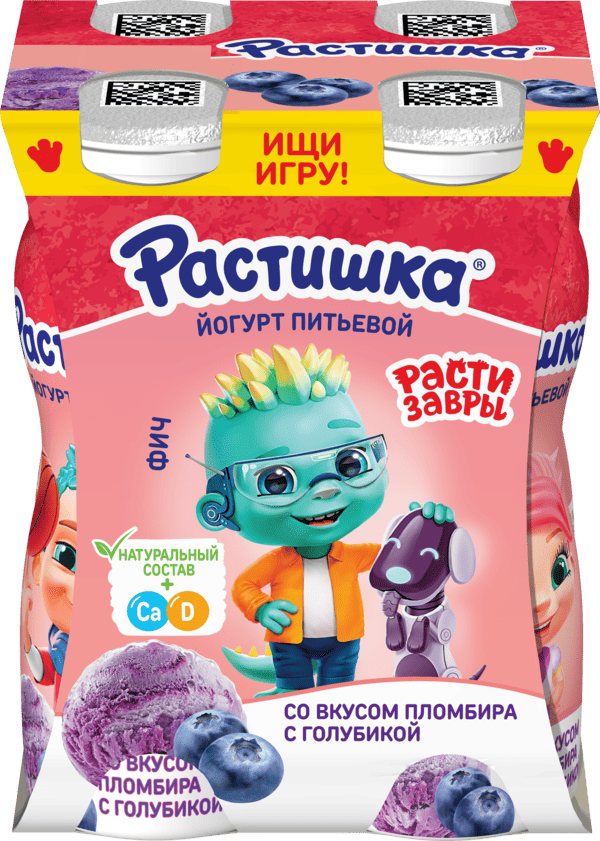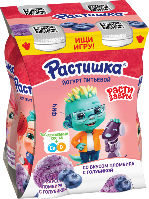 Питьевой йогурт Пломбир с голубикой 90 г «Растишка» в бутылочке изготовлен из отборного молока с использованием йогуртовой закваски, а также спелых ягод от проверенных поставщиков. Только натуральные ингредиенты + кальций и витамин D3. Для питания детей дошкольного и школьного возраста старше 3 лет. С массовой долей жира 1,6 %.